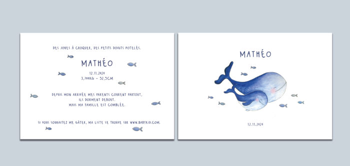 Création du faire-part du petit Mathéo, aquarelle Baleine, poissons et tortue sur demande des parents, le tout imprimé sur un joli papier épais et recyclé.